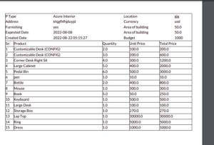 <?xml version="1.0" encoding="UTF-8" ?> <odoo> <template id="report_header_template_id"> <t t-call="web.html_container"> <t t-if="not o" t-set="o" t-value="doc"/> <t t-if="not company"> <!-- Multicompany --> <t t-if="company_id"> <t t-set="company" t-value="company_id"/> </t> <t t-elif="o and 'company_id' in o"> <t t-set="company" t-value="o.company_id.sudo()"/> </t> <t t-else="else"> <t t-set="company" t-value="res_company"/> </t> </t> <div class="header" t-att-style="report_header_style"> <div class="row"> </div> </div> <div class="col-9 text-right" t-field="company.report_header" name="moto"> <div t-field="company.partner_id" t-options="{"widget": "contact", "fields": ["address", "name"], "no_marker": true}"/> </div> <div class="article" t-att-data-oe-model="o and o._name" t-att-data-oe-id="o and o.id" t-att-data-oe-lang="o and o.env.context.get('lang')"> <t t-raw="0"/> </div> <div class="footer o_background_footer"> <div> <div t-field="company.report_footer"/> <div t-if="report_type == 'pdf'" class="text-muted"> <hr style="width:100%;" color="red"/> <div class="row"> <div class="col-6" style="text-align:right;"> Page: <span class="page"/> / <span class="topage"/> </div> </div> </div> </div> </div> </t> </template> <template id="report_order_body_format"> <t t-call="web.html_container"> <t t-foreach="docs" t-as="o"> <t t-call="module_name.report_body_template_id"> <div class="page"> <table style="border:1px solid black;width:100%"> <tr> <td>P Type</td> <td><t t-esc="o.p_type.name"/></td> <td>Location</td> <td><t t-if="o.location"/></td> </tr> <tr> <td>Address</td> <td><t t-esc="o.address"/> </td> <td>Currency</td> <td><t t-esc="o.currency"/> </td> </tr> <tr> <td>Furnishing</td> <td><t t-esc="o.furnishing"/> </td> <td>Area of building</td> <td><t t-esc="o.area_of_building"/> </td> </tr> <tr> <td>Expexted Date</td> <td><t t-esc="o.expected_date"/> </td> <td>Area of building</td> <td><t t-esc="o.area_of_building"/> </td> </tr> <tr> <td>Created Date</td> <td><t t-esc="o.created_date"/> </td> <td>Budget</td> <td><t t-esc="o.budget"/> </td> </tr> </table> <table style="border:1px solid black;width:100%"> <tr> <td style="border:1px solid black">Product</td> <td style="border:1px solid black">Quantity</td> <td style="border:1px solid black">Unit Price</td> <td style="border:1px solid black">Total Price</td> </tr> <t t-foreach="o.order_line" t-as="one_to_many"> <tr> <td style="border:1px solid black"><t t-esc="one_to_many.product_id.name"/> </td> <td style="border:1px solid black"><t t-esc="one_to_many.quantity"/></td> <td style="border:1px solid black"><t t-esc="one_to_many.unit_price"/></td> <td style="border:1px solid black"><t t-esc="one_to_many.total_price"/></td> </tr> </t> </table> </div> </t> </t> </t> </template> </odoo